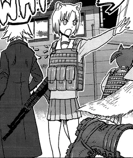 Like the other AK variants, she has short hair and feline like tail and ears with hers being blonde in color. She also wears Akaganekou's standard two-stripe uniform.
